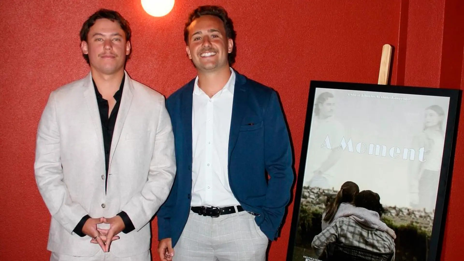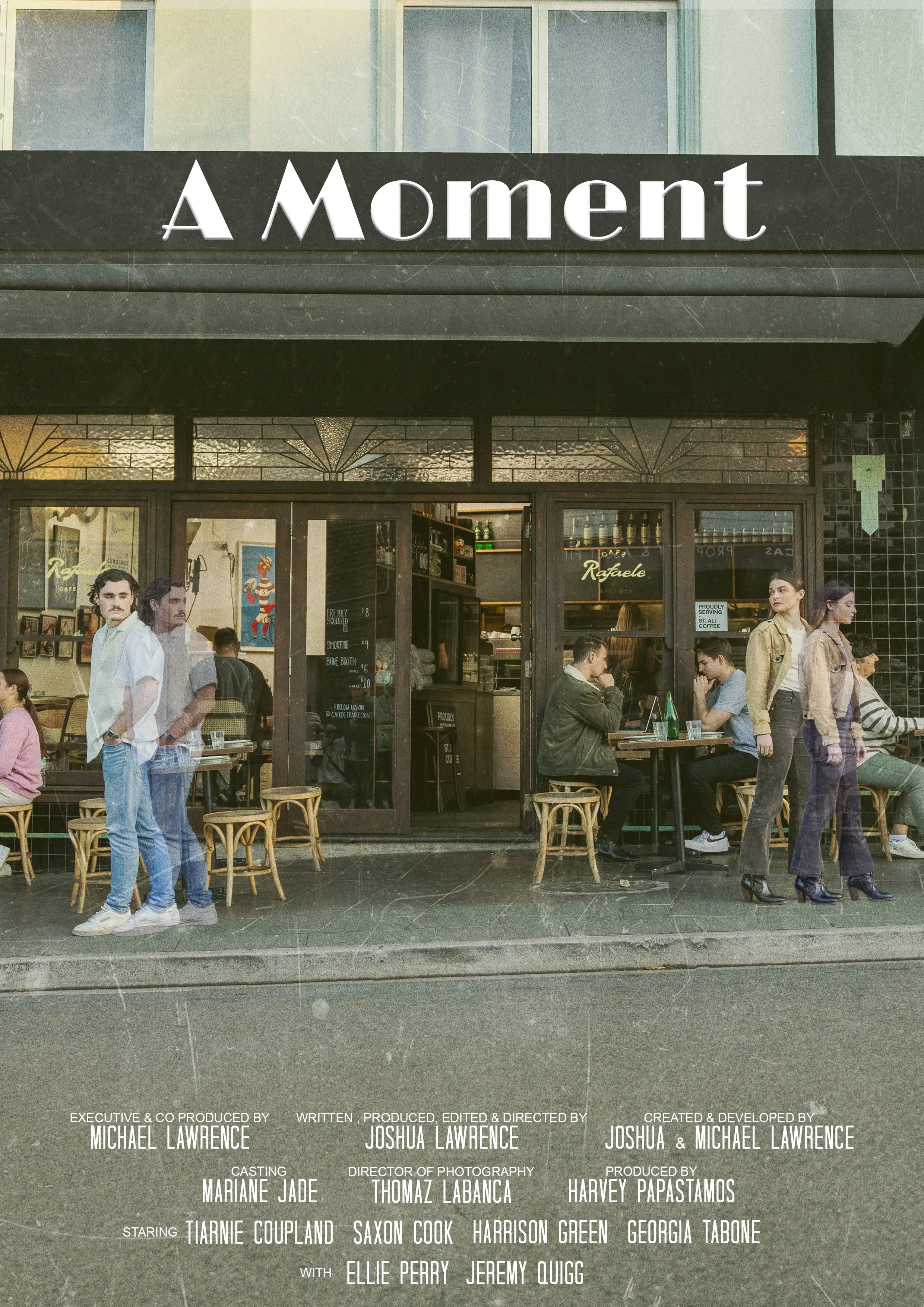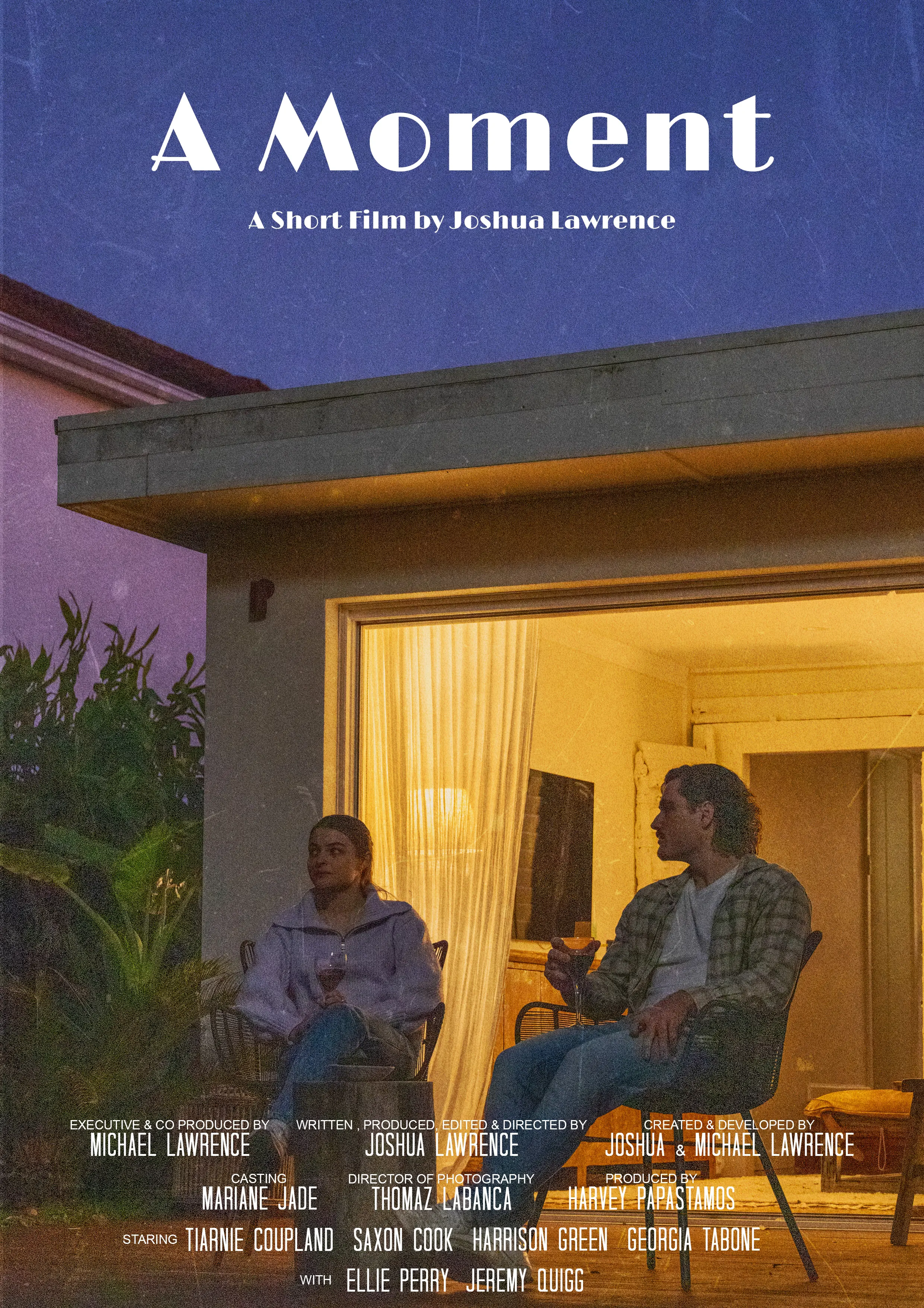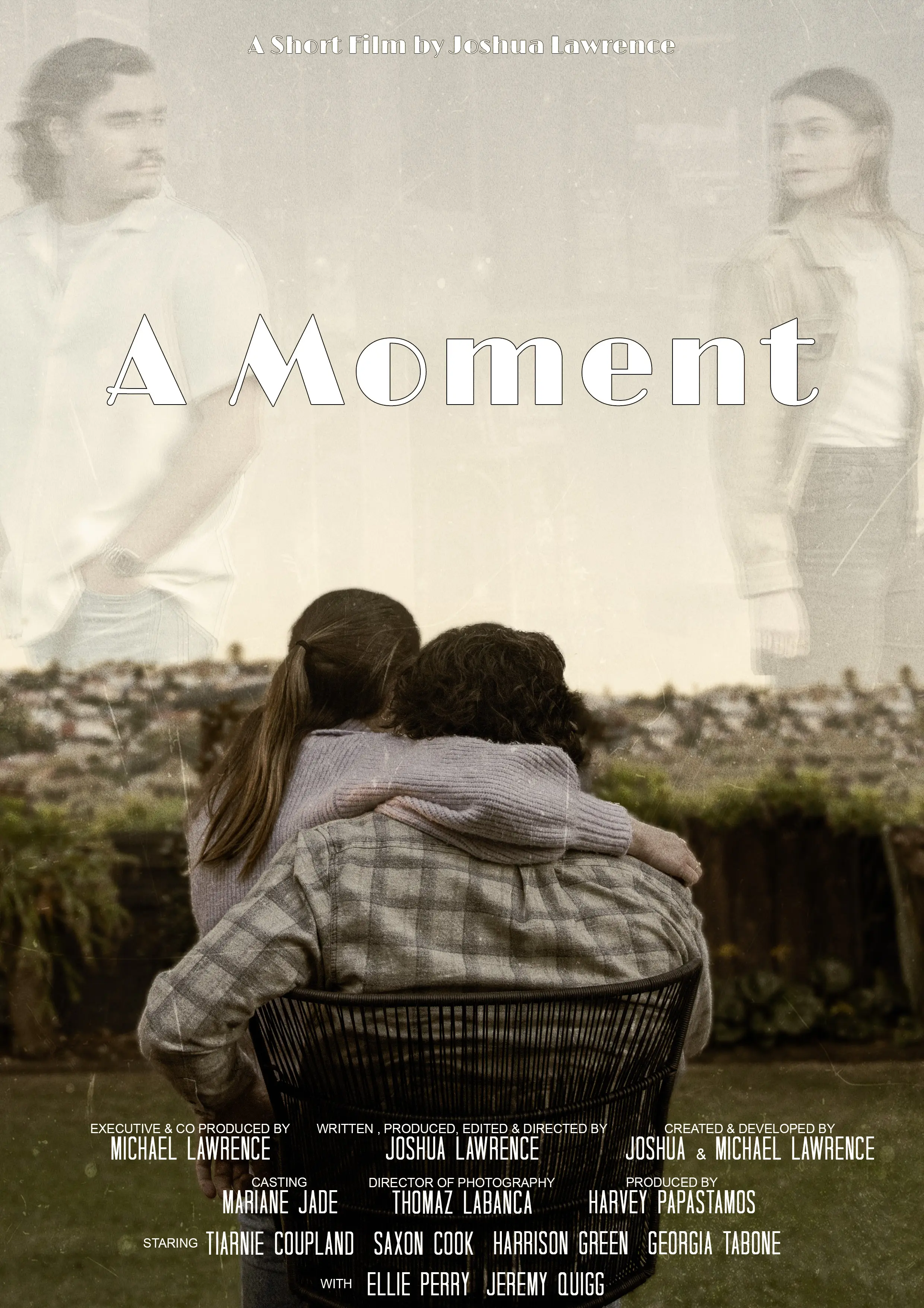 Create three poster designs for a short film "A Moment," directed by Josh Lawrence. Capturing the essence of the narrative's themes of connection and loss. The goal is to artfully showcase the intertwining emotions of the protagonists, Cillian and Amelia, while encapsulating an old-school aesthetic.